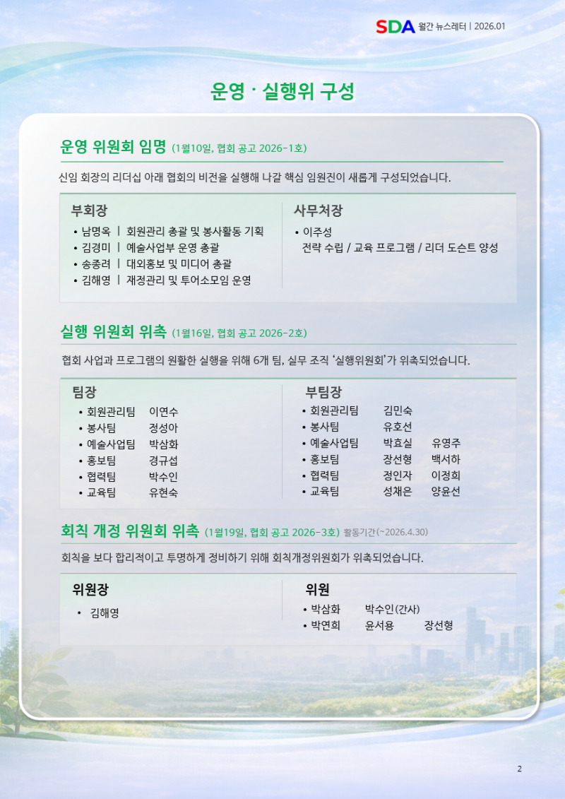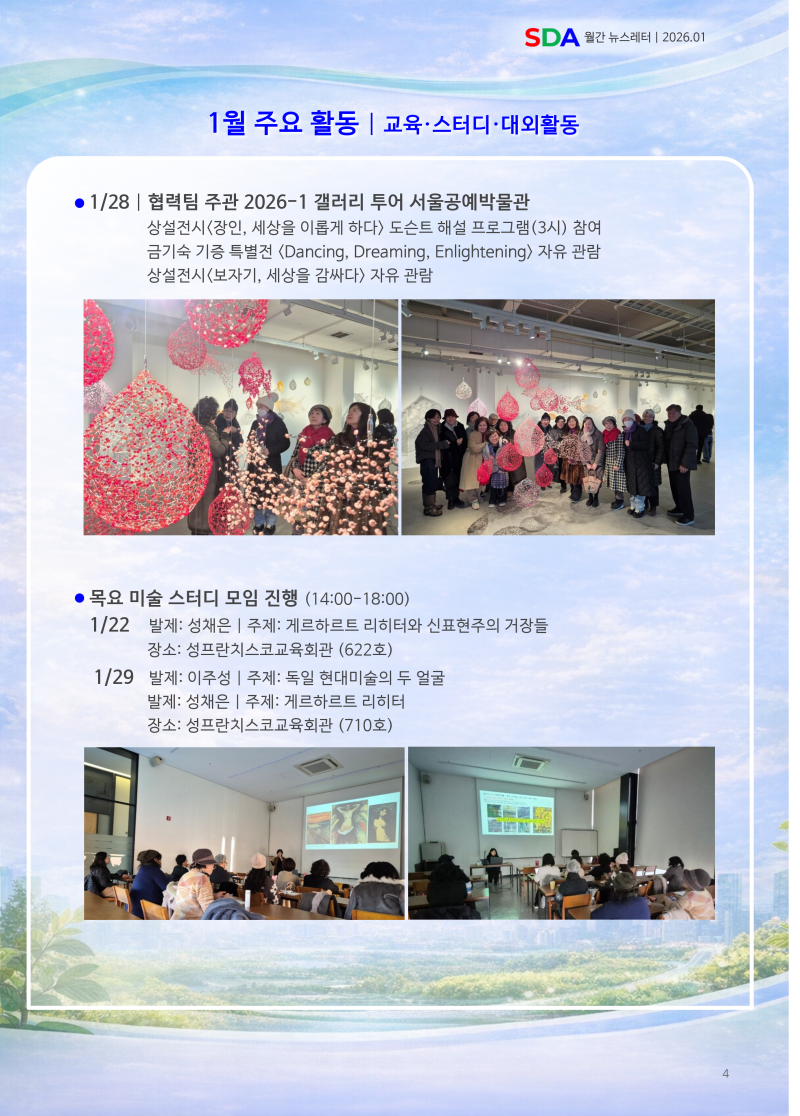 서울도슨트협회 월간 뉴스레터 1월호페이지 정보작성자 SDA 댓글 0건 조회 642회 작성일 26-02-08 14:39본문[이 게시물은 SDA님에 의해 2026-04-05 02:38:42 공지/뉴스에서 이동 됨]