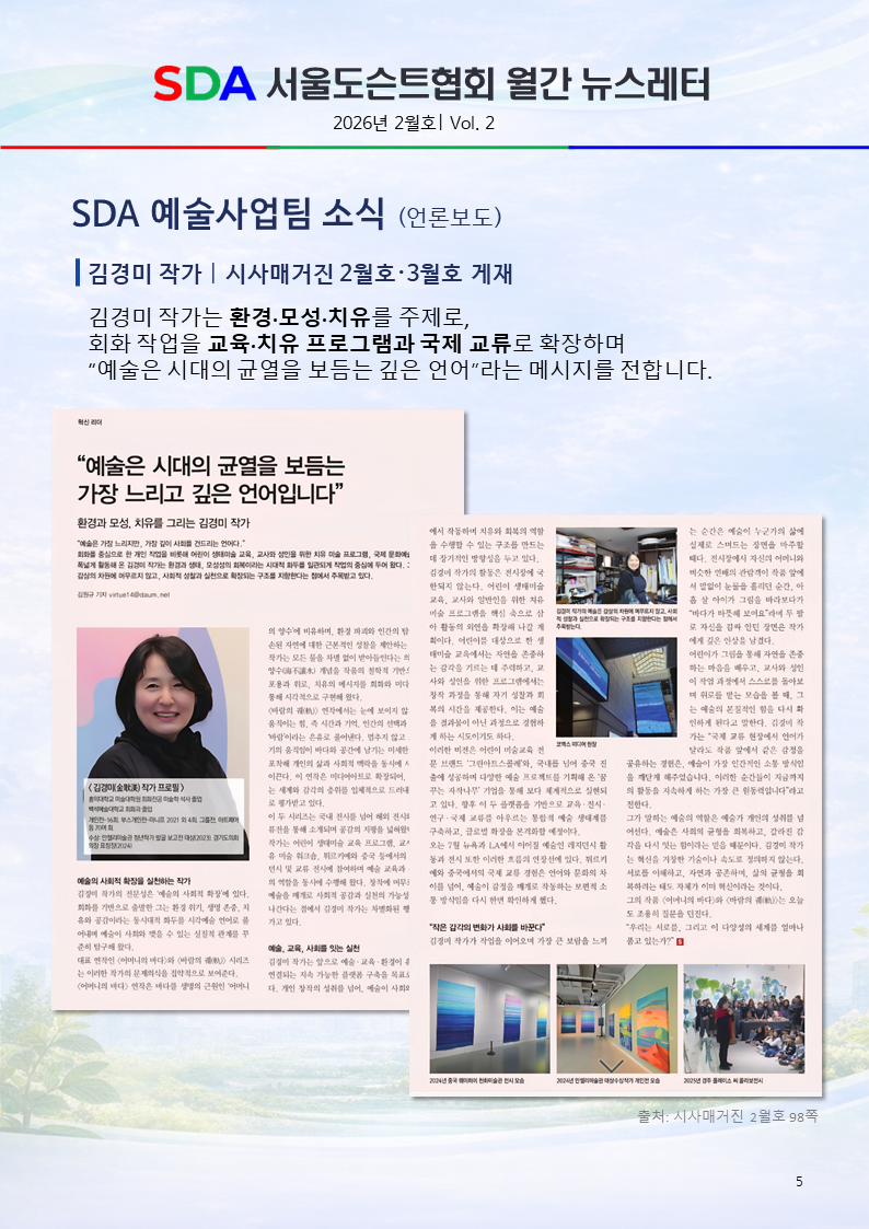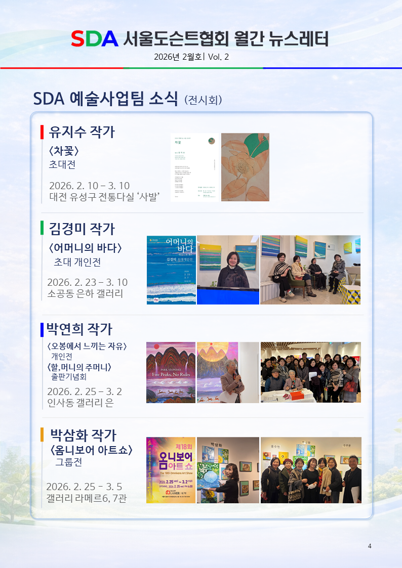 서울도슨트협회 월간 뉴스레터 2월호(2)페이지 정보작성자 SDA 댓글 0건 조회 403회 작성일 26-03-04 21:44본문서울도슨트협회 월간 뉴스레터 2월호 발간 [이 게시물은 SDA님에 의해 2026-04-05 02:38:42 공지/뉴스에서 이동 됨]